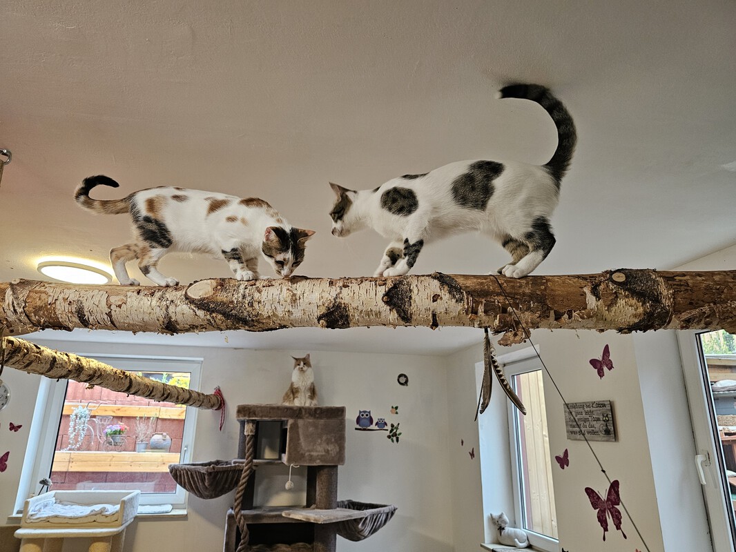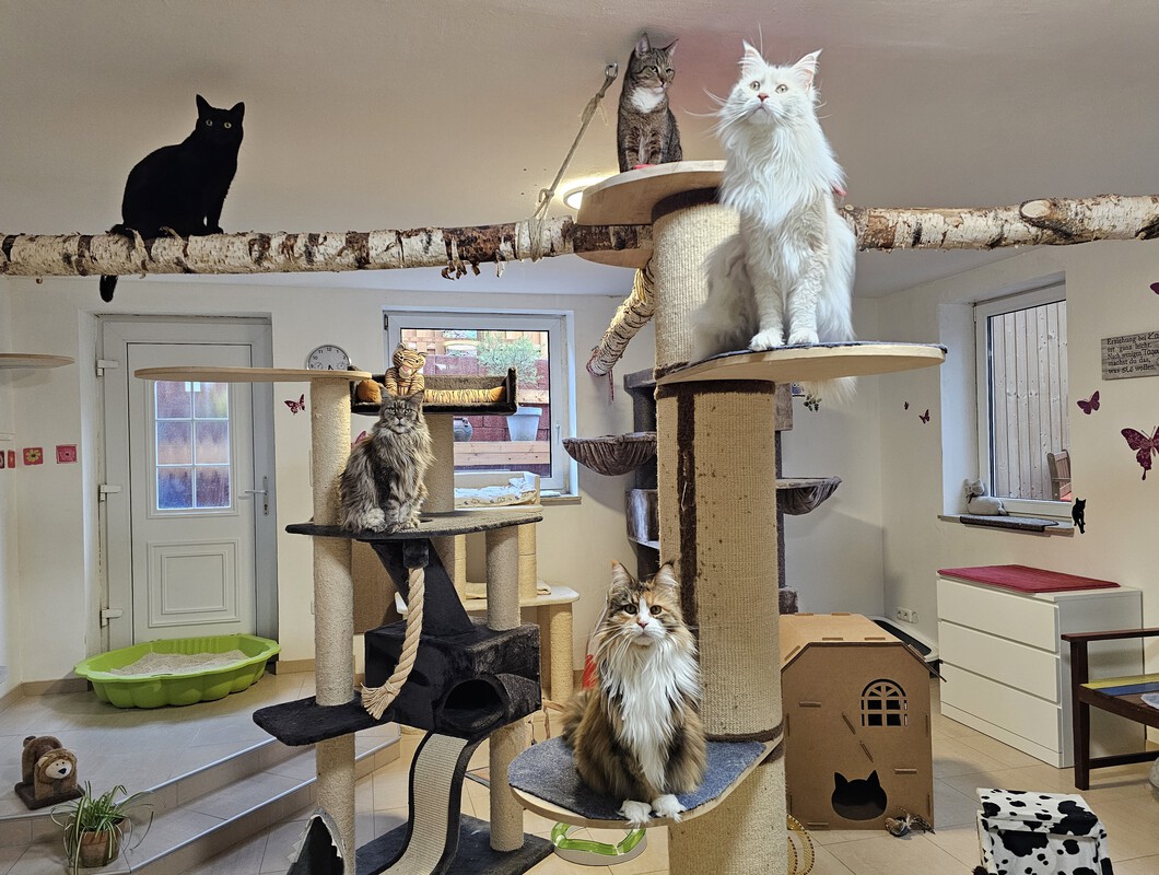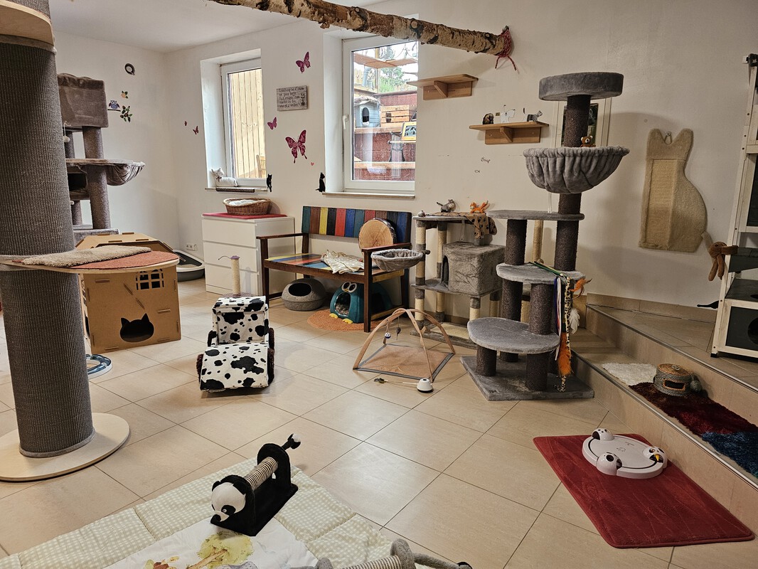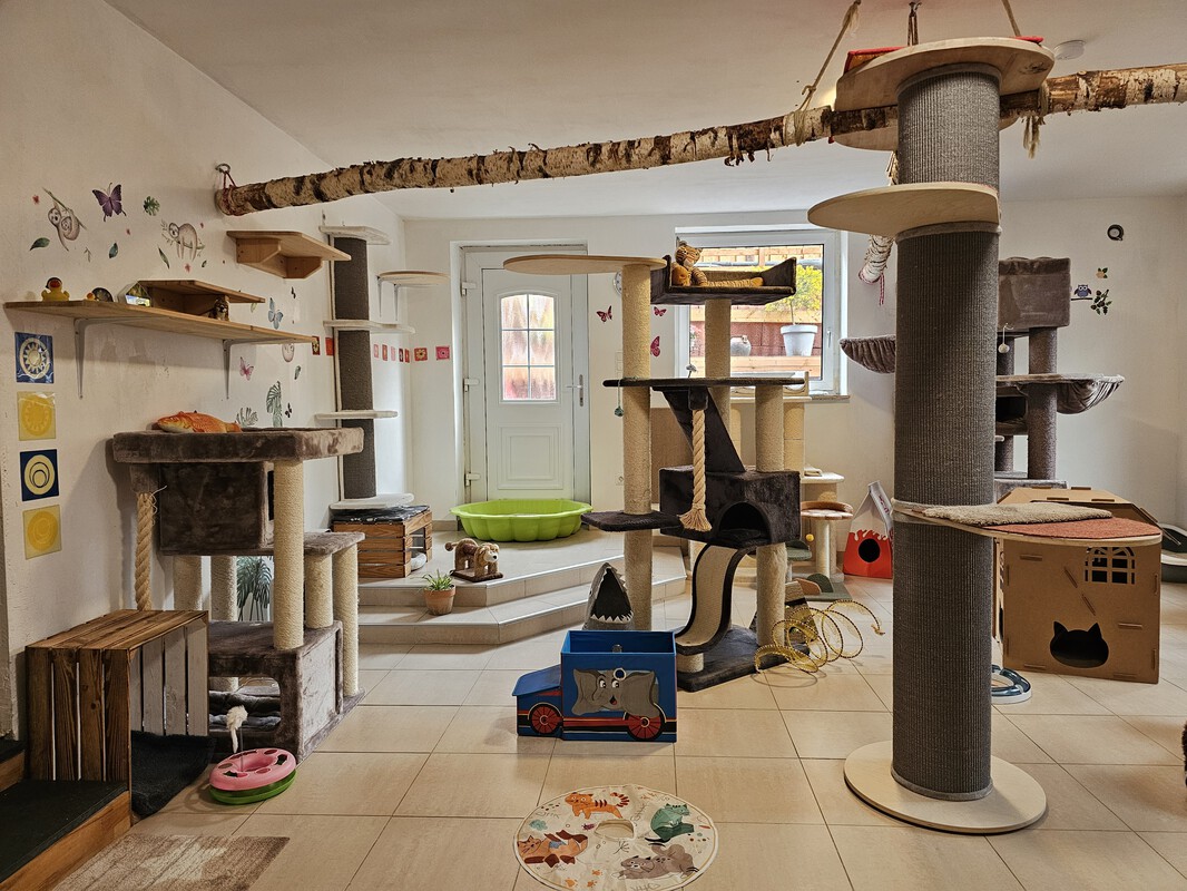 Die Katzenräume sind innovativ, abwechslungsreich und artgerecht eingerichtet. Es gibt ausreichend Versteck-, Kletter- und Spielmöglichkeiten, und jede Katze kann ihren bevorzugten Rückzugsort finden.