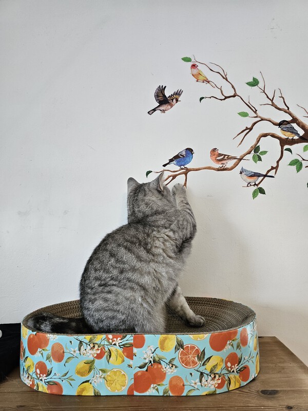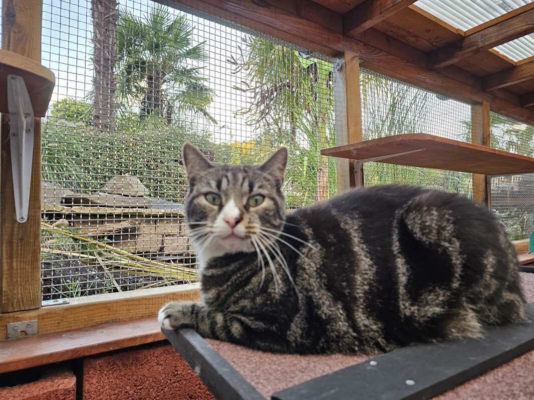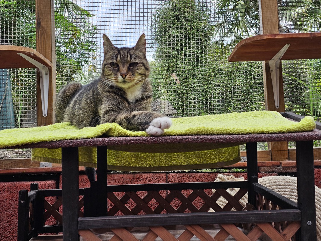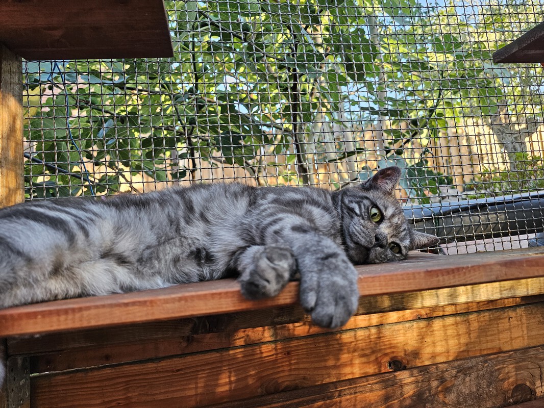 Zusätzlich zu den gesicherten Außengehegen haben wir möglichst viel Natur in die Räume geholt: So gibt es z. B. Birkenstämme zum Krallenwetzen und Klettern, bewegtes Wasser aus dem Brunnen und eine katzenverträgliche Bepflanzung mit Katzenminze, Katzengras, Katzengamander etc.